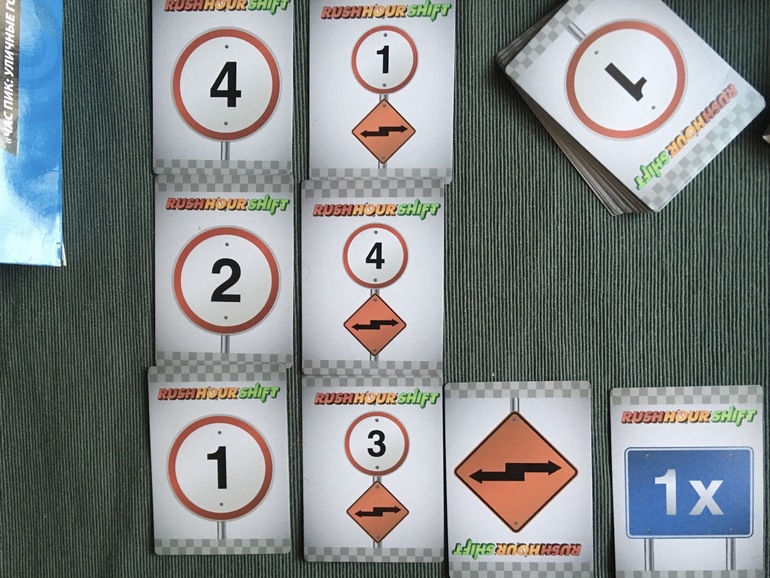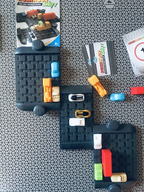 Это вариант той самой известной головоломки, но только для двоих игроков. Час пик у нас тоже есть, сын планомерно проходит задания, но все карточки пока не одолел. Ему очень нравится головоломка для одного, но вот эта дуэльная логическая игра, по моим наблюдениям, нравится ему ещё больше. Цель игры та же. Провести первым свою машинку( серебристую или золотую) сквозь пробку и выехать за пределы поля. В книжечке с правилами есть схемы 10 сценариев первоначальной расстановки машинок на игровом поле, но каждый раз игра будет уникальной, так как Вы не просто двигаете в свой ход машинки, освобождая дорогу, а используете для этого специальные карточки. Каждому игроку в начале игры таких карт выдаётся 4 штуки, в свой ход игрок выбирает одну из них, выкладывает в центр стола и совершает действие согласно этой карте.
