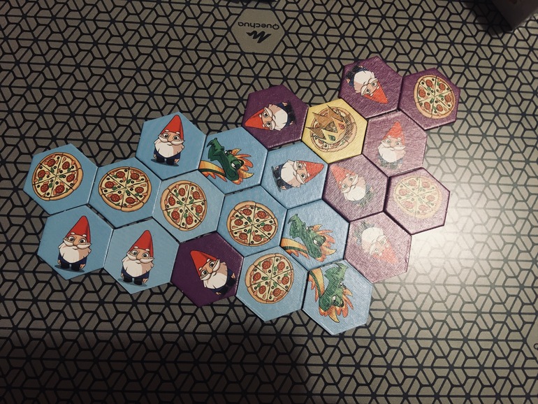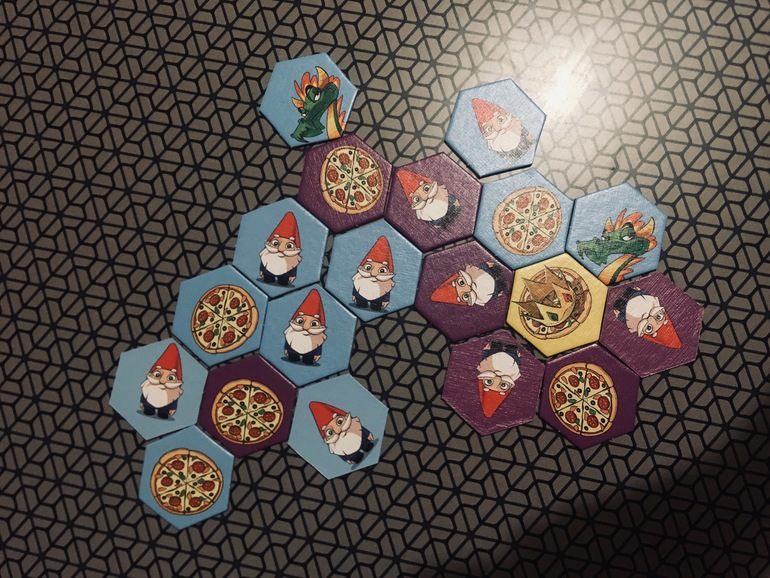 Долго лежала неигранной. Уже вечером предложила сыну попробовать партию. Рекомендованный возраст от 8 лет. У каждого игрока определенное количество жетонов своего цвета( точно сейчас не вспомню сколько, 14 или 16). На жетонах изображены гномы, пицца и драконы. Задача выкладывать по очереди жетоны , чтобы в конце игры как можно больше ваших гномов касались гранями пиццы. Некоторые жетоны двусторонние, на одной, например, нарисована пицца, а на другой стороне дракон. Вы можете обмануть соперника, выложить жетон стороной с пиццей, а потом в нужный момент перевернуть жетон драконом вверх и прогнать гномов соперника с поля. Совершенно несложная, необязательная к покупке игра. Я её купила по акции за смешные деньги. Особого восторга не вызвала у меня, сын тоже не скажу, что проникся, но вторую партию попросил сыграть.