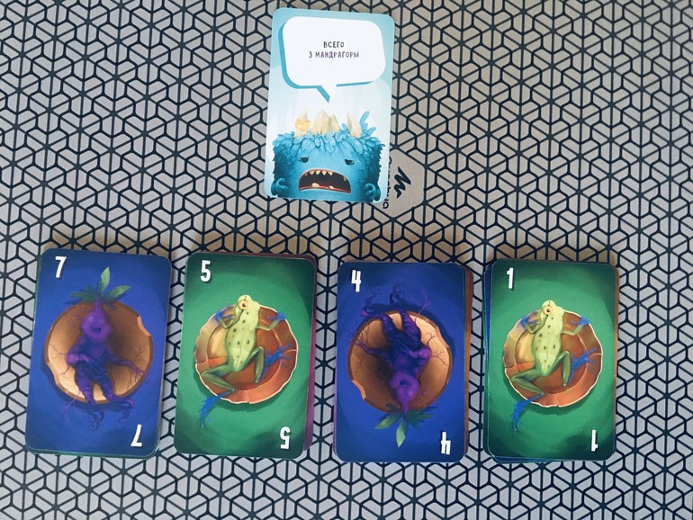 Тоже играли вдвоём с сыном и тоже первый раз с ним. Игра рекомендована с 8 лет, но , мне кажется, возраст для полноценной игры нужен постарше. Играли самый легкий сценарий, но немного не по правилам, потому что с самых первых ходов я поняла, что без наводящих вопросов сын игру не потянет. Поэтому я спрашивала, есть ли у него лягушки, или может ли он выложить на это место гриб и т.д. Сын тоже иногда сам спрашивал у меня , куда он может положить эту карту. И ещё я поняла, что пока ему трудно сопоставлять выложенные ингредиенты с условиями монстров. Держать в памяти все четыре условия, да ещё с учётом того, что они меняются, ребёнку тяжело, а читая каждый раз, он все равно не все условия может понять или увидеть на картах. Так что моему восьмилетнему сыну однозначно рано. Сыграли одну партию, не выиграли в очередной раз. Остался у нас один монстр, а ингредиенты закончились.