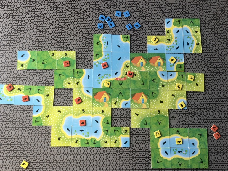На фотографии несколько тайлов дочка расположила неправильно, мы потом увидели при подсчете очков.Сын даже расплакался в первой партии, сбрасывать карту с искателем ему было невероятно трудно. Да и сопоставить дорожки тоже не смог к концу игры. Вторая партия далась ему уже легче, он даже занял второе место. Каруба совершенно точно будет частенько появляться на нашем столе осенними и зимними вечерами.