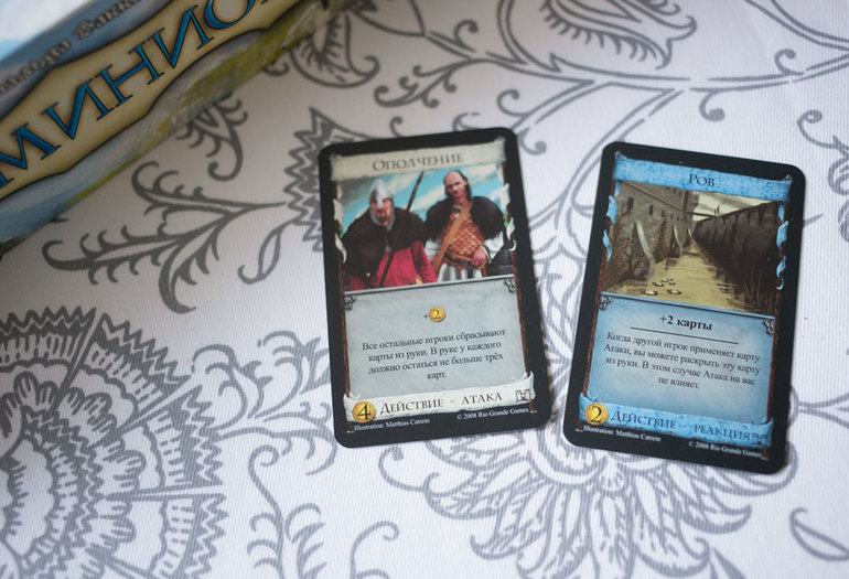 Наша партия прошла очень азартно! Простота правил позволила разложить игру в будний вечер. Мы играли максимально мирно - без атак и проклятий, но их розыгрыш, безусловно, добавил бы перчинки. Текст на картах понятный, проблем с интерпретацией не возникло, возможно, пару раз мы обращались к тексту правил за более подробным описанием. Ждем выходных, ждем гостей, чтобы попробовать "Доминион" более широким составом.