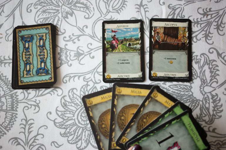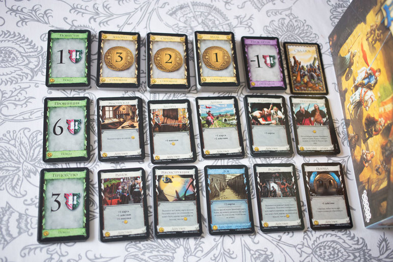 С подготовкой к игре проблем не возникнет - нужно лишь сформировать королевство с помощью 10-ти видов карт королевства, причем от партии к партии их комбинации могут быть разнообразными, благодаря чему, каждая партия становится практически уникальной. В игровую зону также необходимо выложить карты меди, серебра и золота, а также карты поместья, герцогства и провинции - основные карты победы, карты проклятий и свалки. Каждый игрок получает 7 карт меди и 3 карты поместья на руки, перетасовывает карты и кладёт на стол перед собой лицевой стороной вниз. Так, в личной зоне игрока формируется его колода. Затем из неё игрок тянет на руку 5 карт.