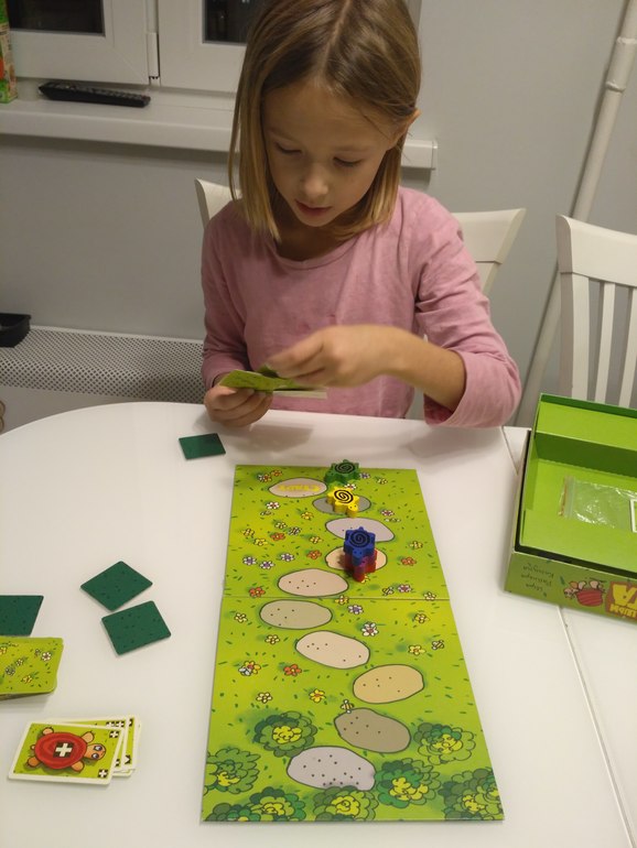 Черепашьи бега мы по прежнему нежно любим, Аня стала играть с азартом, научилась лукавить, мне сложно угадать какая черепаха её. В этой партии на последнем ходу сделала ошибку, всех черепах подвела на одну клетку от финиша и конечно у меня была припасена карта с черепахой моего цвета и я выиграла. Обмудили финал, согласна, что ошиблась.