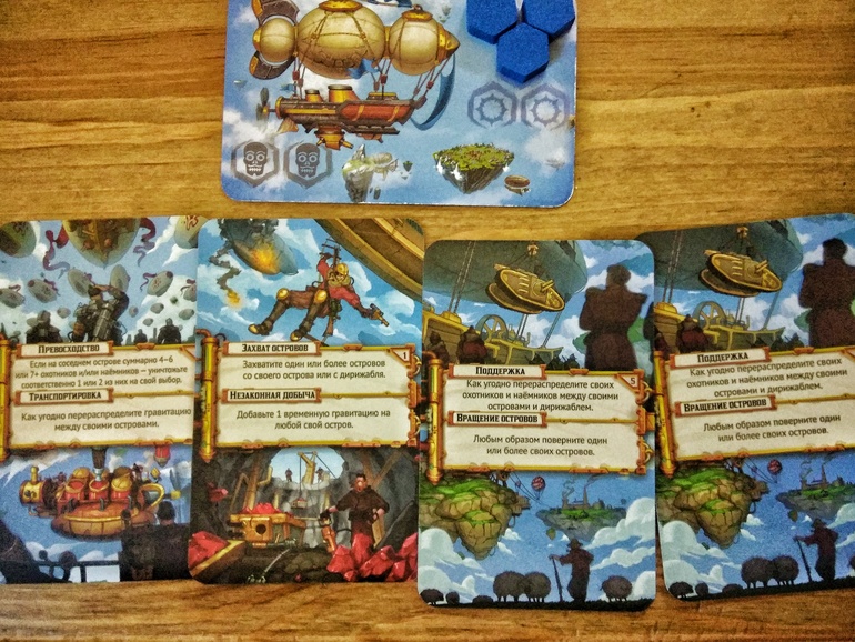 Каждый игрок имеет в своём распоряжении дирижабль (у них есть 2 стороны - обычная и с особыми свойствами корпорации, я пока играла без применения особых свойств), 5 охотников, 12 карт действий (6 видов по 2шт. каждой) и 1 карта рокировки.