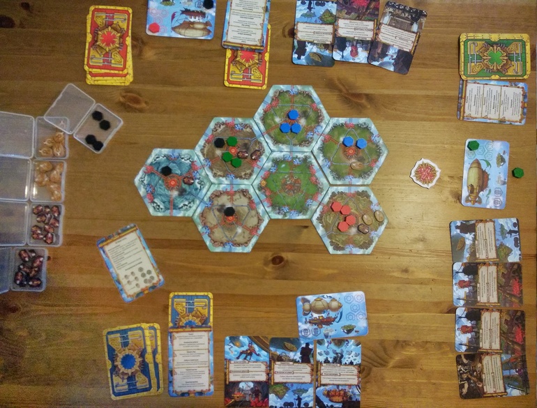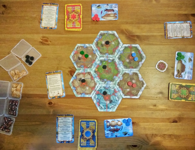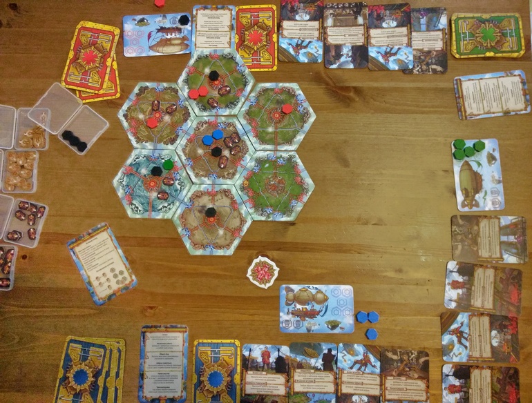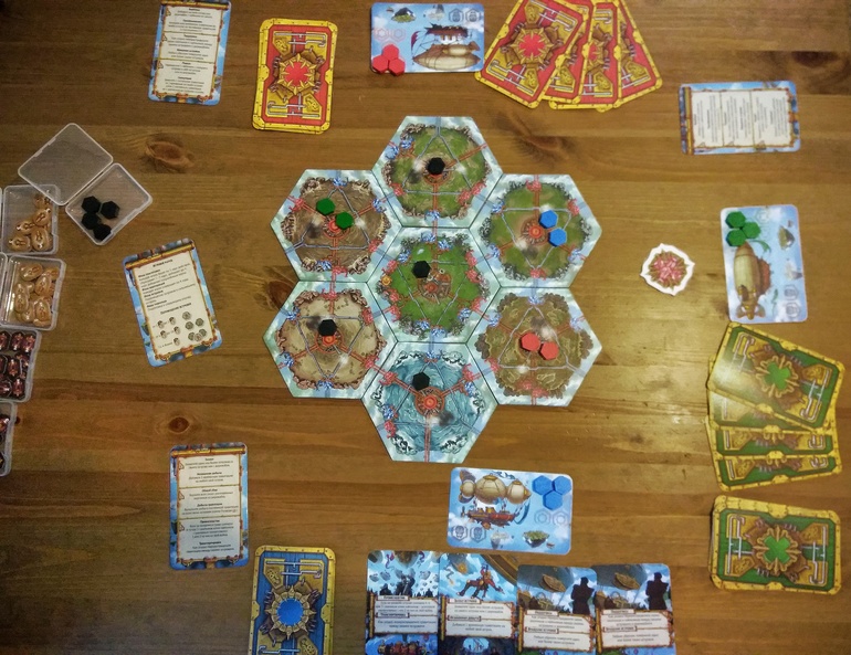 Картон очень плотный, гексы прекрасны. Арт притягивает взгляд. Карты обычные, в 4 цветах для каждого из игроков. К сожалению, не обошлось без мелких неприятностей - на жетоне первого игрока и паре жетонов из мини-дополнения расслаивался картон (я подклеила ПВА, всего и делов-то))), и одна из карт с синей рубашкой была перепутана на жёлтую (написала издателю, мне оперативно прислали замену).