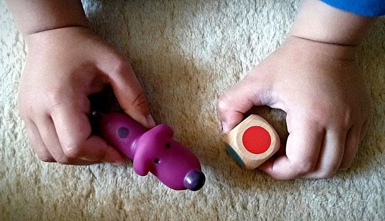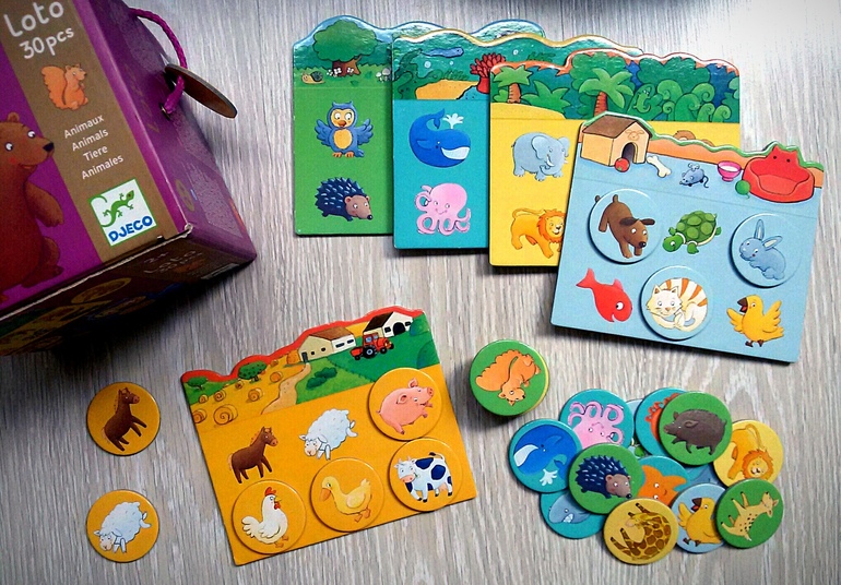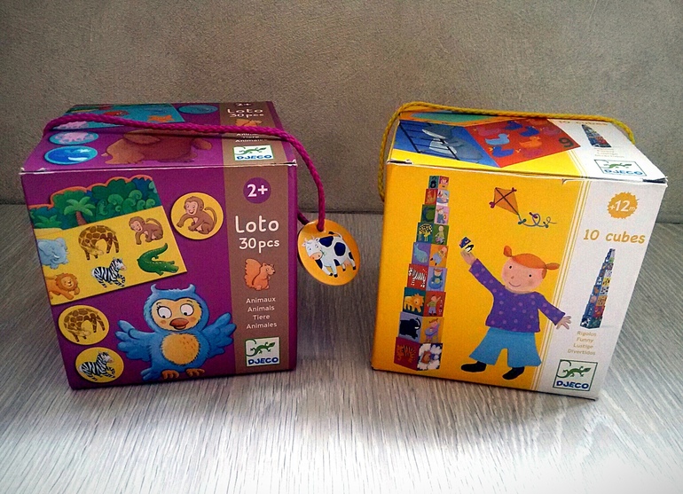 А из эти игрушек дети вроде уже выросли, но все равно периодически играют с забавными кубиками и очень милым лото от фирмы Djeco.