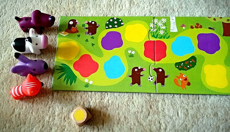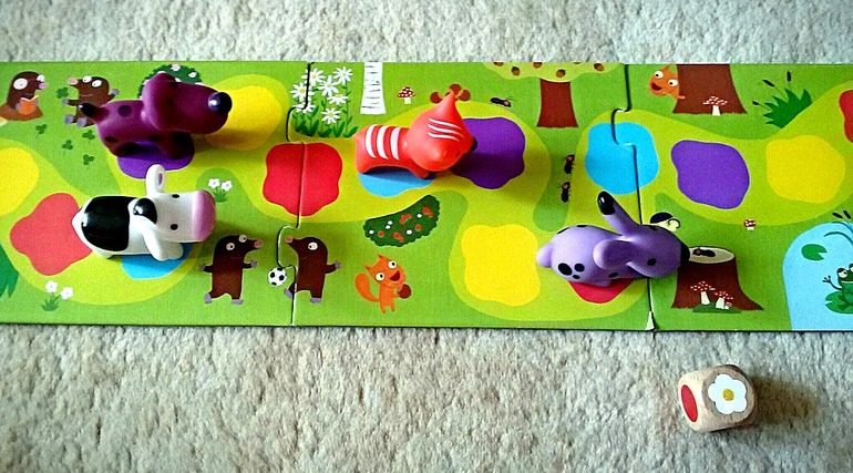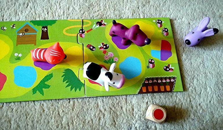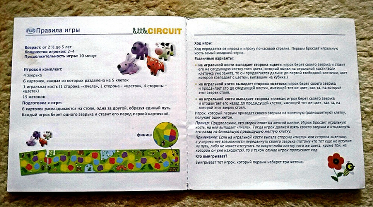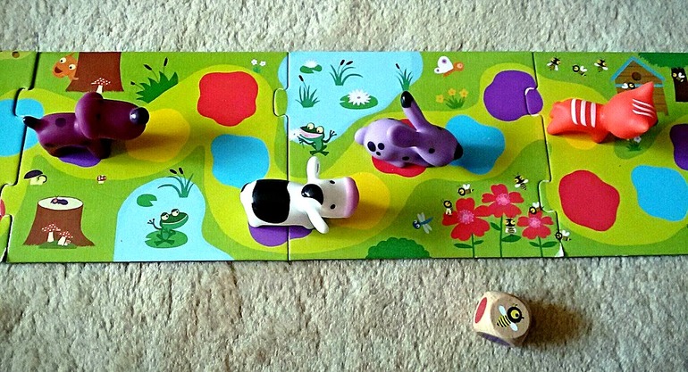 В наборе идут четыре милейших зверька, поле из очень плотного картона в виде пазла из шести частей, игральный кубик и 15 жетонов с изображениями насекомых. Также есть правила на русском языке, в которых сказано, что выигрывает тот игрок, который первым наберет три жетона. Но мы жетонами не пользуемся, потому что игра быстрая и тремя партиями мы никогда не ограничиваемся. У нас каждый раз побеждает тот, кто первым дошел до финиша.
