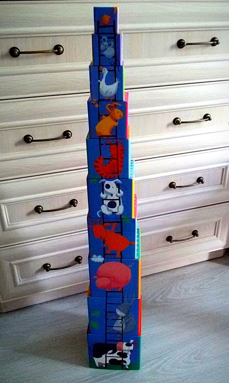 Данные кубики предназначены не только для игры, но и для изучения цветов, предметов и животных. Всего в комплекте 10 кубиков, которые компактно вкладываются один в другой. Построенная из них башня получается выше трехлетнего ребенка.