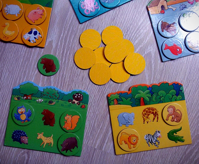 Когда дети были совсем маленькие, мы просто заполняли карточки и учились находить нужное изображение. Далее началась игра в стандартное лото. Если дети играют вдвоем, то каждый берет себе по два поля. Фишки мы теперь кладем в центр стола рубашкой вверх. Каждый игрок в свой ход переворачивает одну фишку и смотрит, подходит ли она для его карточки. Если фишка не подходит, она возвращается в общую кучу и все фишки перемешиваются, чтобы другие игроки, которым она подходит, не могли быстро заполнить свои карточки за счет других игроков. Таким образом, игра становится более динамичной, захватывающей и интересной.