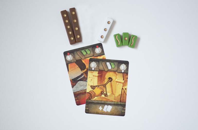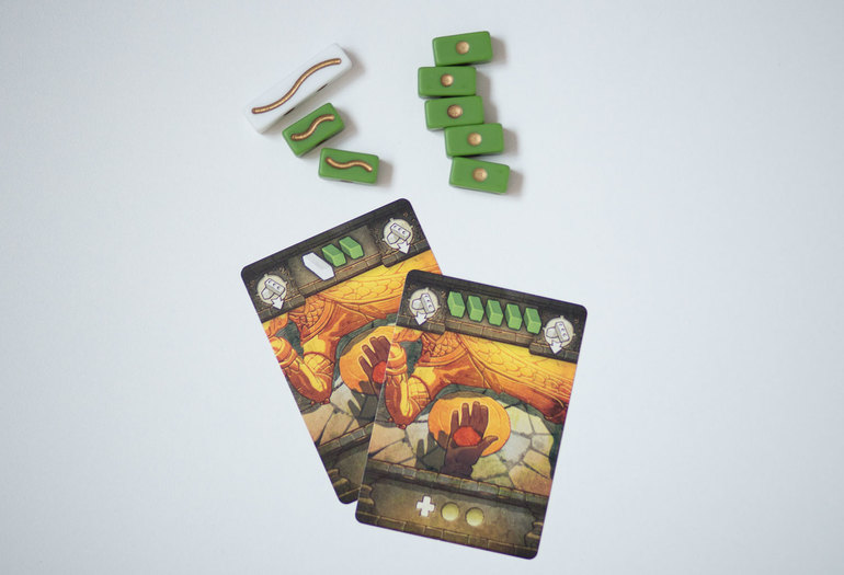 Раскладка представляет собой два планшета для каждого игрока, окруженных тайлами реликвий. Особый завораживающий эффект производят необычные кубики, то есть, нет, конечно, не кубики - камни судьбы :) С помощью символов, изображенных на них, игроки либо будут бороться за тайл-плитку для своего храма, либо активировать и применять эффекты карт. Кроме того, важным компонентом игры являются амулеты, они приносят игрокам дополнительные очки, бонусы и возможности. Остается раздать каждому игроку по 5 карт и игра начинается!