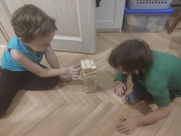 Сначала младший принес Дженгу, самостоятельно собрал башню прямо на проходе и позвал играть брата.