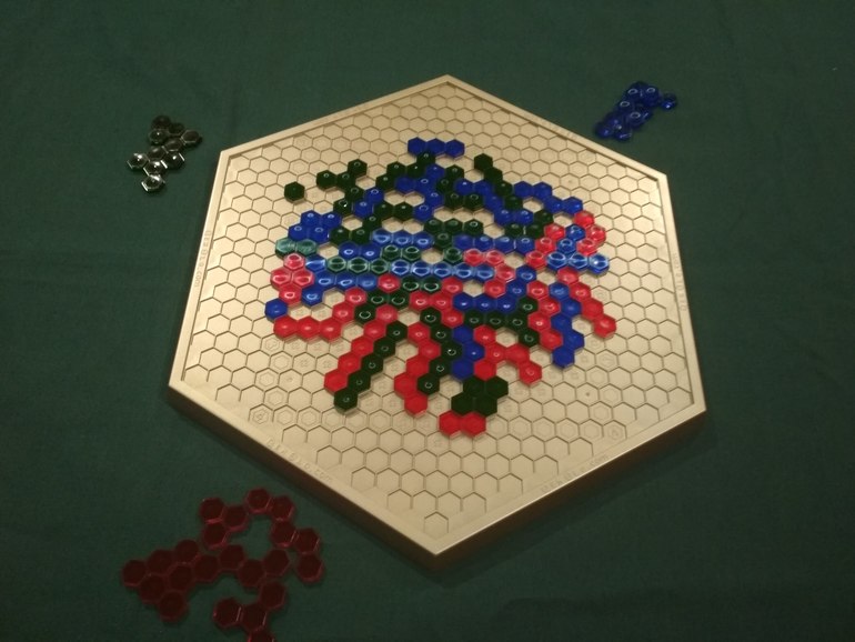 Как определились с полем, первый игрок выкладывает свою "фишку", второй свою и так далее. Но не бездумно, а с "проходами" между своими фишечками. Нельзя, чтобы фишка одного цвета перекрывала ход, должен быть зазор, например между стыком двух соседних цветов. Вот это поначалу никак не учитывалось. Но быстро разобрались. Я играла красными, продула-23