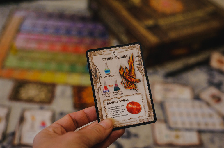 В игре будто появилась цель, и уже не просто собираешь, что получается или выгодней. Самое интересное, что по времени игра занимает примерно сталько же, только закончиться может очень неожиданно. Еще вроде и в двух колодах карт хватает, а тут Бац!- кто-то взял и добавил два последних рецепта в свое Великое делание! Философский камень готов, игра закончена. У нас так вчера и вышло, я по балах виграла, но муж сделал камень, и мне даже василиск у сына не помог сделать свой - не успела просто. Эх, а попкорн таки пришлось малому алхимику сделать)))) На фото как раз закончилась партия.