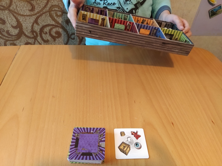 2. Карты заданий кладутся на стол стороной с комнатой вверх, игрок переворачивает верхнюю карту и кладет ее рядом со стопкой предметами вверх. Теперь игроки пытаются собрать все предметы указанные на карте в комнате, лежащей сверху стопки.