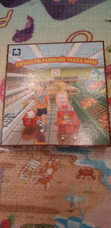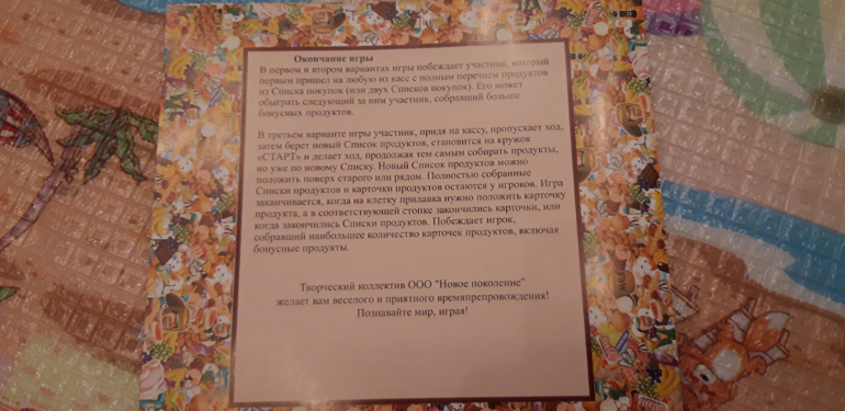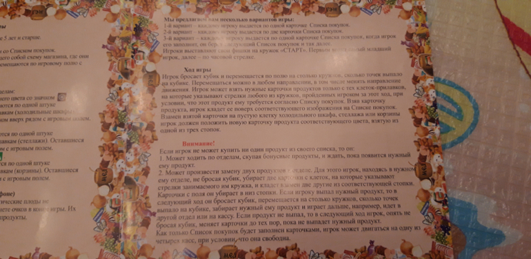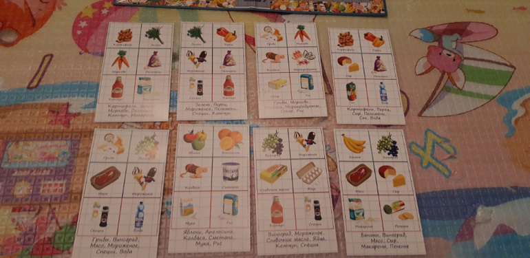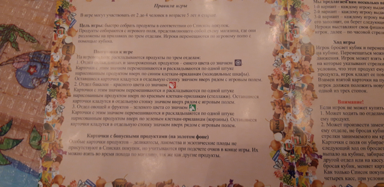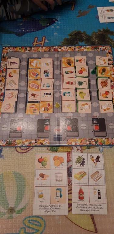 Сама коробочка небольшая из плотного картона. Внутри поле, карточки продуктов, карточки со списками продуктов, кубик и игровые фишки. Играть могут от 2 до 4 человек. Мы играем следующим образом: