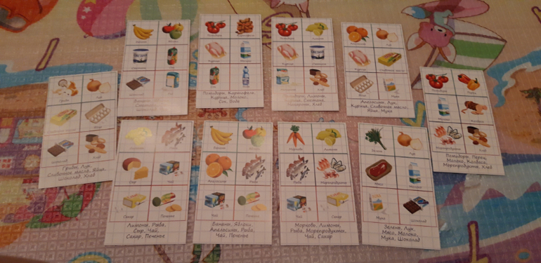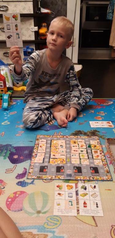 В магазине три отдела - бакалея, фруктово-овощной отдел, отдел заморозки. К каждому отделу идут отдельные карточки с продуктами. Перемешиваем карточки с продуктами и заполняем полки в магазине карточками с продуктами изображениями вверх. Оставшиеся карточки откладываем в сторону изображениями вниз. Берем себе по две карточки со списками продуктов. Кто быстрее заполнит свои списки продуктами, тот и выиграл. Кидаем кубик и ходим по клетками по очереди, стараясь идти по направлению к нужным нам продуктам. Если игрок по количеству шагов остановился у полки с продуктами, которые ему не подходят по списку, мы с ребенком делаем замену двух карточек с продуктами. Если пришел нужный продукт, то забираем его в свой список. Если пришел другой продукт, то ход переходит к другому игроку.