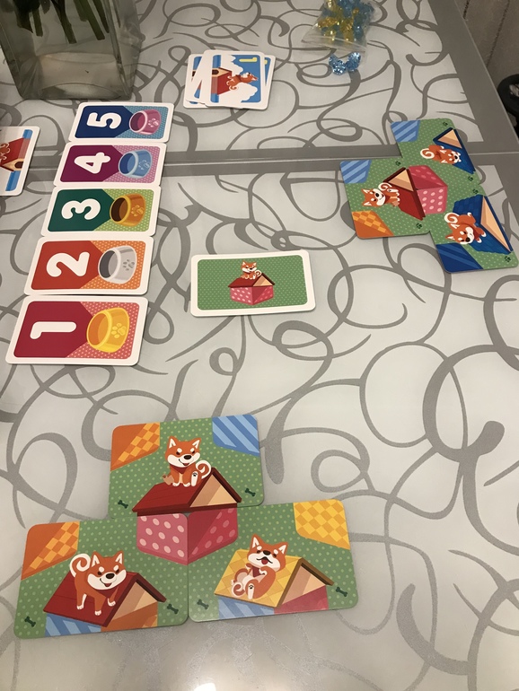 Кто первым строит дом (дома) хватает карточку с любой цифрой от 1 до 5 и ждёт остальных. Чем меньше цифра, тем больше очков можно заработать. За очки даются кристаллики, их и просчитывают потом.