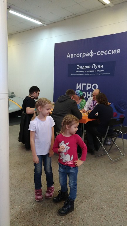 Напоследок фото с Игрокона, мои Аня и Катя на фоне разработчика игры, Эндрю Луни.