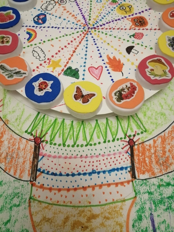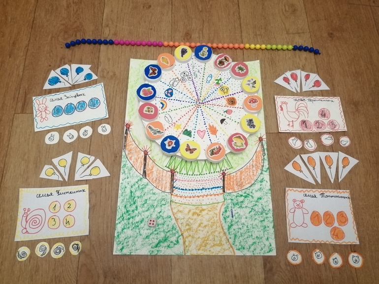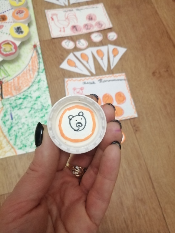Краткие правила в моем пересказе: в летнем парке есть колесо обозрения , на котором хотели бы покатать своих четырех малышей четыре семьи: Топтыгины, Перышкины, Зайцевы и Улиткины. Всего в колесе 16 кабинок - как раз хватит на всех детей. Очень хотели сделать колесо стоящим, но не придумали как крепить крышечки, так что просто представьте себе, что наше колесо стоит. Может, потом накрутим наши крышечки на резьбу или насобираем металлических крышечек и посадим на магниты. Не суть.