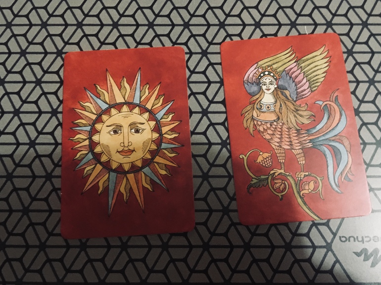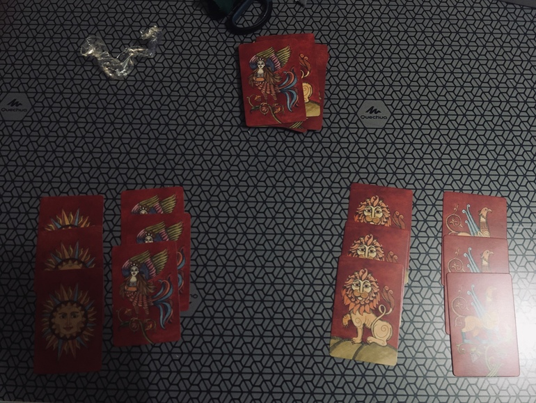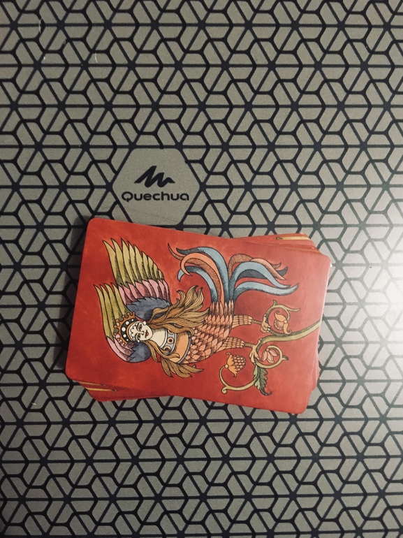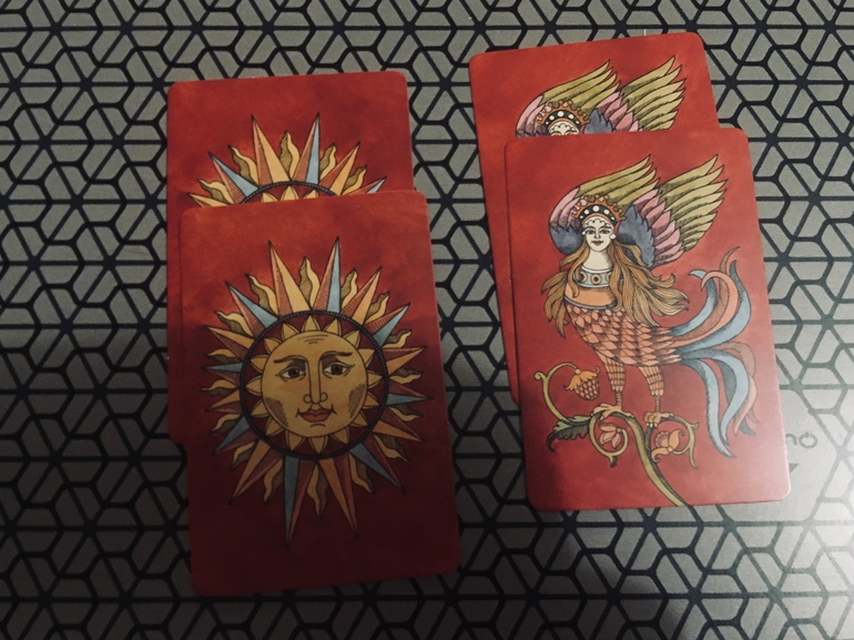 В правилах, кстати, рекомендовано собирать по 4 оберега, но на деле оказалось, что с 32 картами это сделать сложно, поэтому мы собираем по три . И ещё карт всё-таки мало, по идее их должно быть больше. При игре втроём у нас возникла ситуация, когда я смогла в первом этапе боёв заработать всего три карты с разными оберегами, т.е. во втором этапе участие уже не принимала. Потом уже в лабиринте прочитала, что люди докупали ещё одну колоду, чтобы сбалансировать игру.