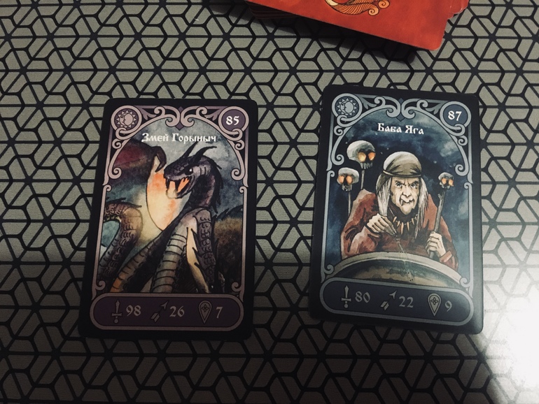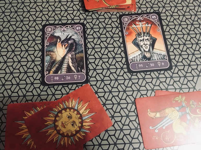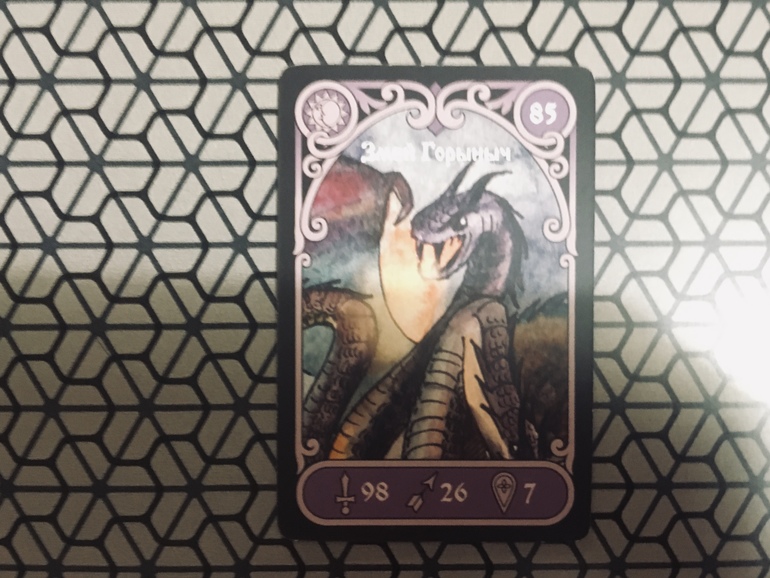 Затем второй игрок берёт карту из колоды . У Змея Горыныча сила 98, вполне можно попробовать сразиться именно этим показателем, его и объявляет.
