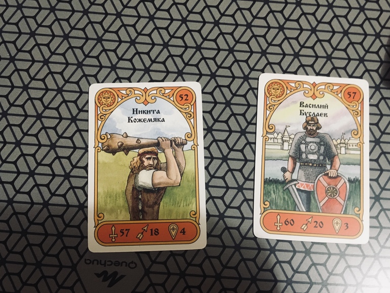 Второй игрок берёт карту из центра колоды и переворачивает её. У Василия Буслаева скорость равна 20 . Он выигрывает бой.