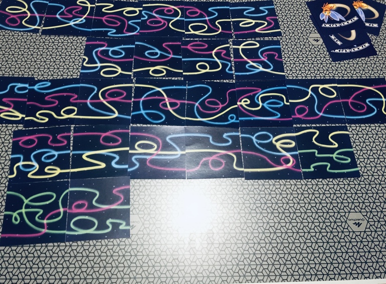 Время за игрой пролетало незаметно, все тайлы нам не удалось использовать. Очень интересно, как мы будем действовать через партий 10. Мы с детьми поняли, что нужно стараться до последнего держаться подальше от соперников и идти туда, где край ещё неизведан. Думаю, вдвоём игра более спокойно проходит, возможности убежать как никак больше. Играя втроём, в момент, когда стопка тайлов уменьшилась на 2/3 понимаешь, что выкладывая тайл в одном конце поля , ты соединяешь линии, по которым незамедлительно перемещаешься в противоположный конец, и хорошо ещё, если не за борт. Это увлекает и интригует невероятно. Потрясающая игра, лаконичная, быстрая. Будем совершенствовать своё мастерство. Если честно, я не могу себе представить и жутко интересно, как в Цуро играется полным составом, а это, на минуточку, 8 человек. Боюсь даже подумать , что творится на игровом поле.