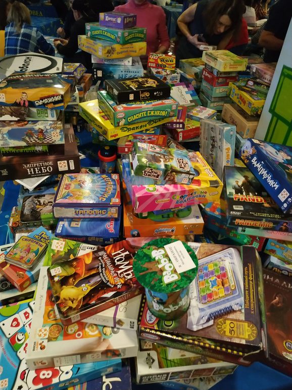 Собрались мы туда со старшим сыном. Приехали в самый час пик наверное. В начале четвертого, вышли из лифта и обалдели... столы-столы, люди-люди.... Вначале быстренько прошли небольшой квест Игроведа по играм, получили маленькие презентики - красивые игровые кубики в шарике-игрушке, сын был ими просто очарован)