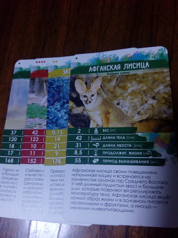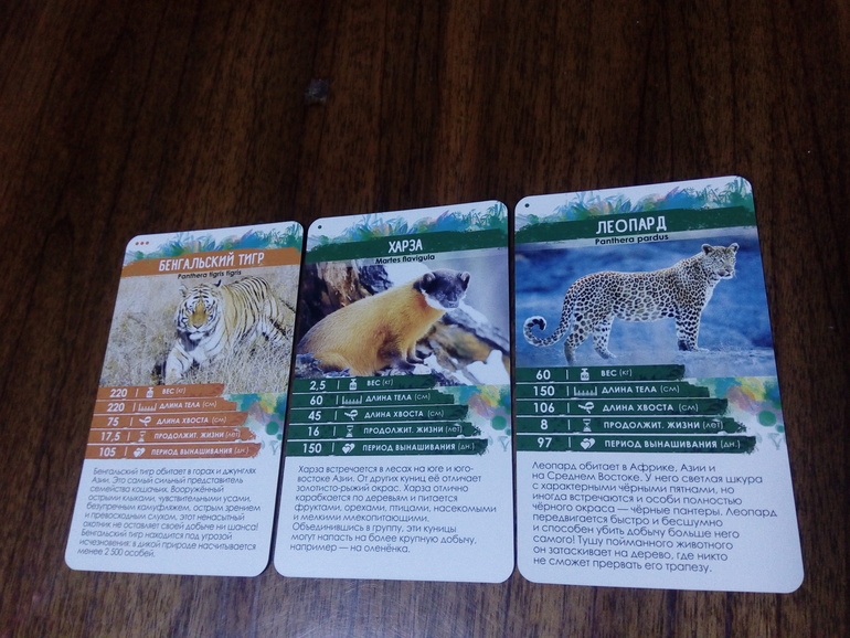 Играем мы одной колодой, там 36 карточек, уже неплохо выучили животных, у кого какой параметр "козырный", т.е. нет меньше или больше, чем у этого животного.