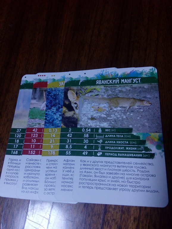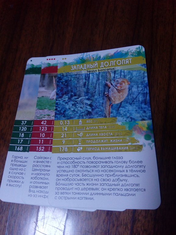 Мой оппонент решает поменять параметр. Чтобы это сделать, необходимо такое условие-животное должно быть более редкое, чем выложенное ранее. Определяеься это просто-одна точка на карточке, означает частовстречаемое животное (они с зелёным фоном), самое редкое имеют 4 точки и на красном фоне. Также есть с 2 и 3 точками.