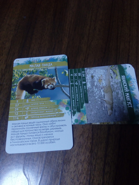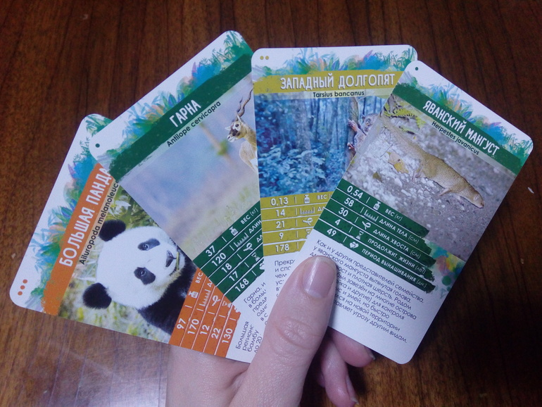 Ну всё, я уже не могу выложить свою Большую панду, потому что все параметры больше у моей панды. Тогда мой друг радостно сгребает все карточки себе, выбирает одно животное, оставляет его себе в качестве победного очка, а остальные карты уходят в сброс. Выигоывает тот, кто первым соберёт 3 карты.