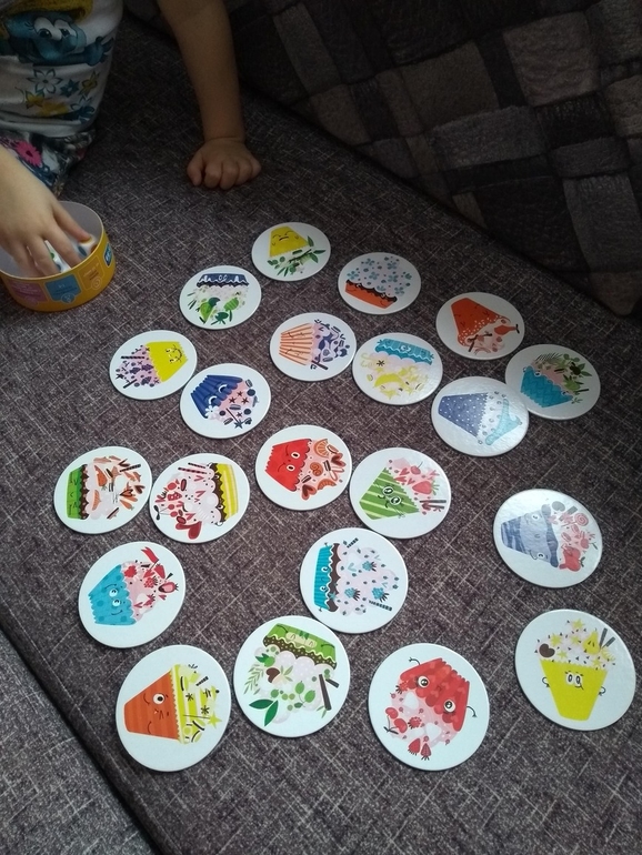 - Кексики от Dodo, аналог Кексов от Granna. Начали с 2.6. Не совсем удачный аналог, так как на кексах присутствует третий цвет - фоновый розовый, а это сбивает с толку (даже меня поначалу) и второй цвет на кексе представлен мелкими детальками. У дочери пока не получается находить в большой куче, поэтому выбираем сначала кексы одного выпавшего цвета и уже среди них ищем нужный. Я уже распечатала кексы Гранна, попробуем пока играть ими.