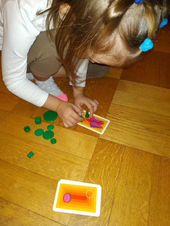 - Геометрическая фантазия. Играем с 2 лет. Поначалу никак не шла, дочь упорно не понимала, зачем ей собирать по какой-то там картинке, а не так, как душа пожелает, со скрипом собирали 1 карточку и на этом все. С 2.6 наметился прогресс, собирает сама почти всегда без ошибок 3-4 карточки.
