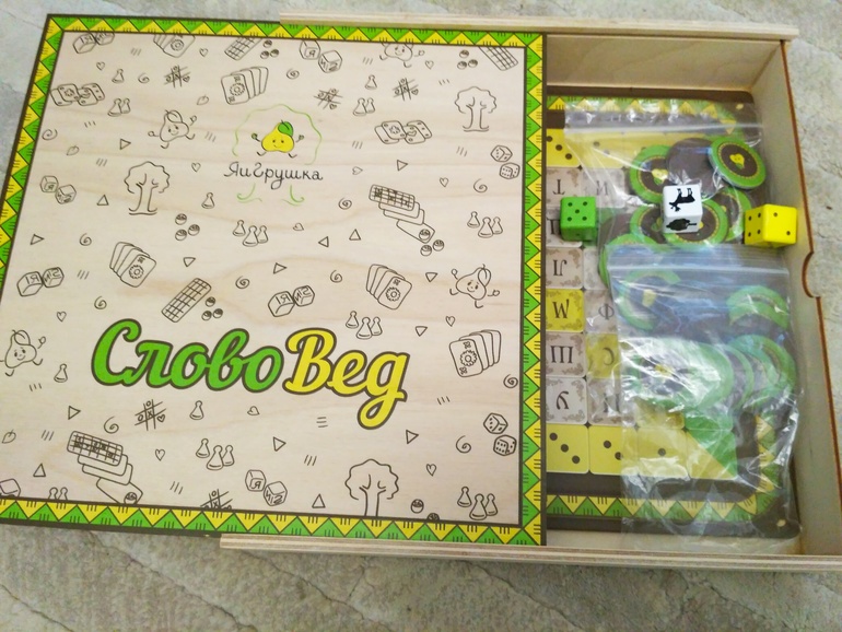 В коробке из фанеры лежит поле, 3 кубика и штрафные жетоны. И правила, которые можно широко варьировать, тем самым регулируя сложность игры и возрастной состав. Суть игры в том, что в каждый свой ход игрок должен назвать слово на определенную букву. Два кубика - жёлтый и зелёный определяет букву, белый - тему, на которую нужно назвать слово.