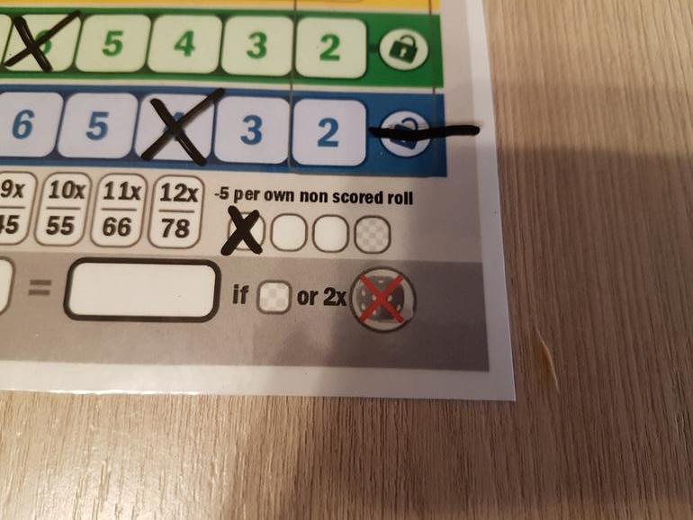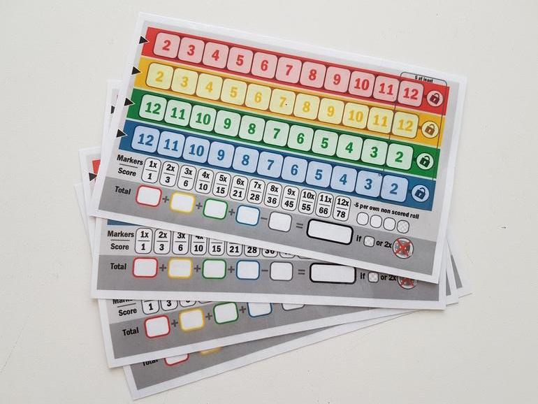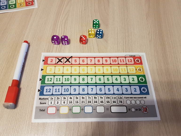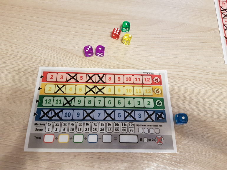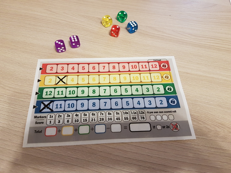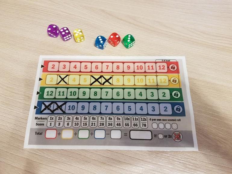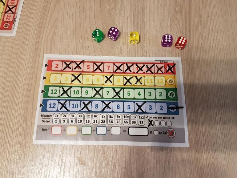Если игрок вычеркивает крайнее правое число в любом ряду (а сделать он это может только в том случае, если в этом ряду у него уже есть 5 вычеркнутых чисел), то соответствующий кубик выбывает из игры. Больше его не бросаем и в ряду этого цвета нельзя ничего вычеркивать даже за сумму белых кубиков.