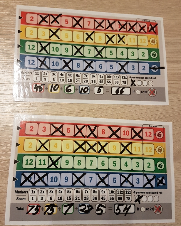 Простая, быстрая и азартная. Партии у нас летят одна за другой, перед школой, перед сном. Нужно надеяться на удачу, но и постараться просчитать выпавшие возможности. Нам с дочкой играть понравилось, пока играли только вдвоем, интересно будет попробовать втроем-вчетвером. При игре вдвоем следить за соперником не сложно. Если он подобрался к концу ряда, то ясно, что при первой же возможности ряд закроет. Поэтому нужно по максимуму этот ряд на своем листе вычеркивать. Помешать друг другу невозможно, надо старяться хотя бы не отставать.