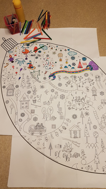 А ещё мы вчера закончили большую раскраску, которую начали ещё в декабре 2016 года. И все эти годы мы доставали её в декабре, дети по чуть-чуть красили, после каникул прятали. И так уже 4 год подряд. Так что эта картинка стала для нас особенной, дети взрослели вместе с ней. Там присутствуют штрихи и раскрашенные детали моего сына в возрасте 5 лет, ничего не исправляли со временем. В следующем году начнём ещё одну.