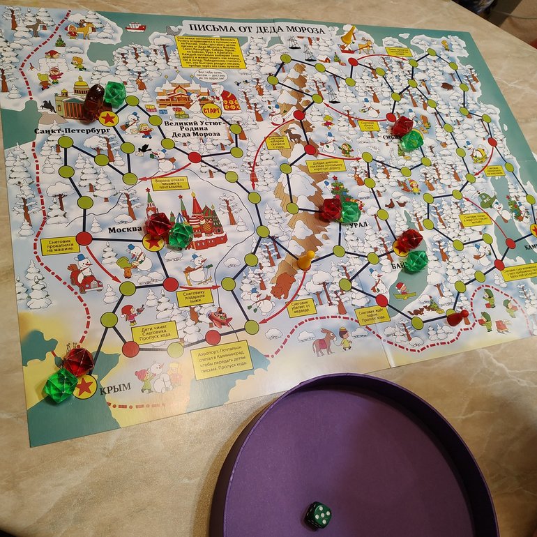 Есть новогодняя, хорошо сегодня поиграли. Там смысл разнести по городам 7 писем. Так мы маркеры придумали, просто кристаллы, бусин плоских не нашла, побывал - отметил.