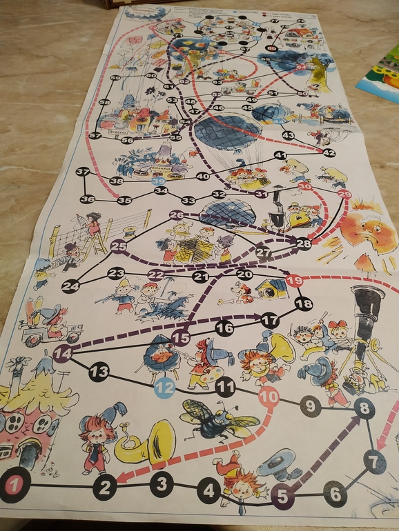 И есть распечатка Приключения Незнайки, даже не помню когда печатала. Она уже поистрепались, по размеру четыре листа А4. Так вот, вопрос к знатокам, что придумать? Обклеить пленкой для учебников, скотчем? Наклеить на картон? С огромным удовольствием поиграли.