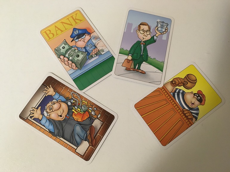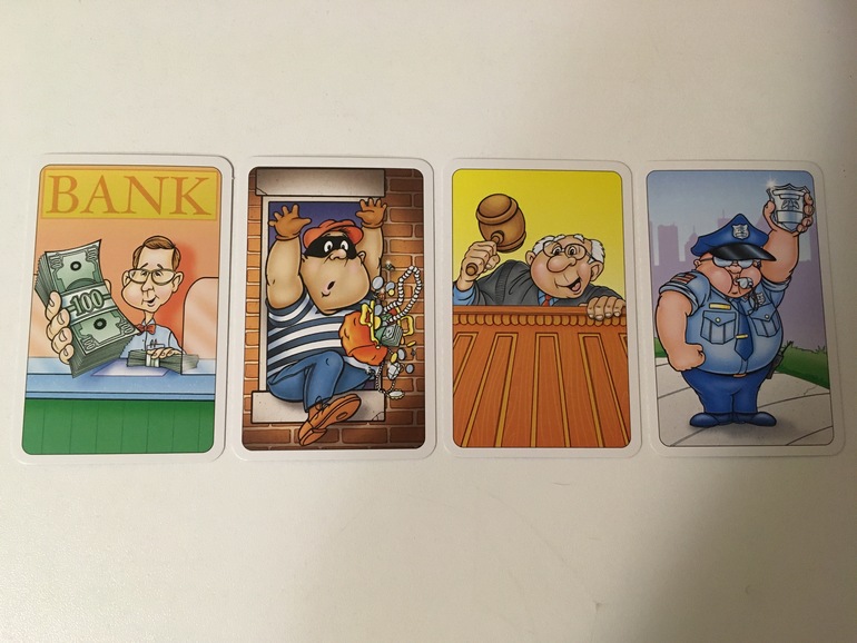 На 68 картах изображены 4 персонажа- судья, грабитель, банкир и полицейский. На некоторых из них эти персонажи занимаются своими делами,