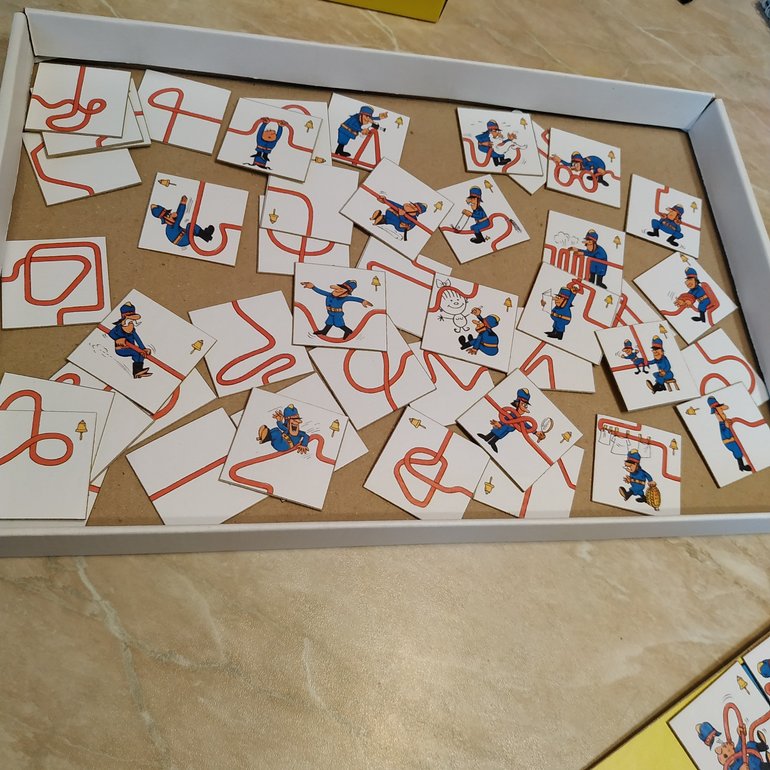Смысл игры до безобразия прост... Карточки кладутся взакрытую, по очереди надо выложить их на поле. Цель- проложить маршрут шланга, можно по разному прокладывать, если карта не подходит, оставляешь себе. Побеждает тот у кого в распоряжении оказывается минимум карт. Но мы часто про это забываем и начинаем просто разглядывать что получилось)))