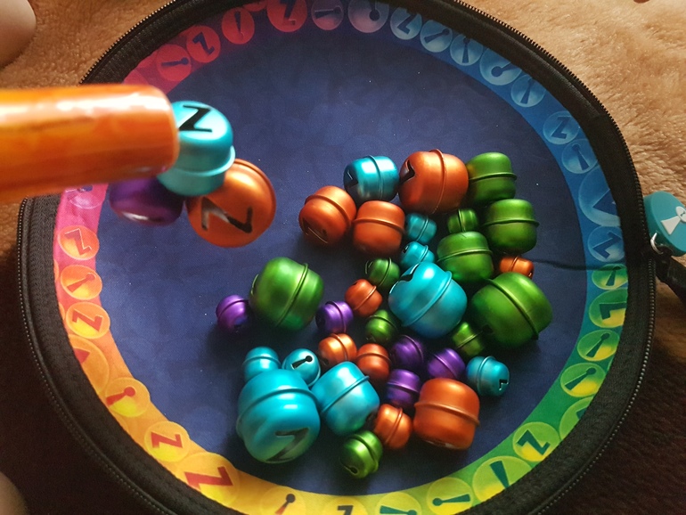 И у нас Звонго стала первой игрой года, вручили вчера вечером, сразу сыграли несколько партий и сегодня несколько раз малая сама приносила звенящую сумочку, чтобы поиграть, правда частенько жульничает пока, помогает себе ручками) Мне не очень понравилось качество прокраски бубенчиков, игру заказывала с амазон, кое какие уже потёрлись местами за 1 день, и ногтем попробовала краска легко сходит, при активной игре наверное быстро потеряет внешний вид( Подруге заказывала в подарок не в сумочке, а с пластиковой тарелкой игру, там кстати бубенчики были совсем другого качества глянцевые блестящие.