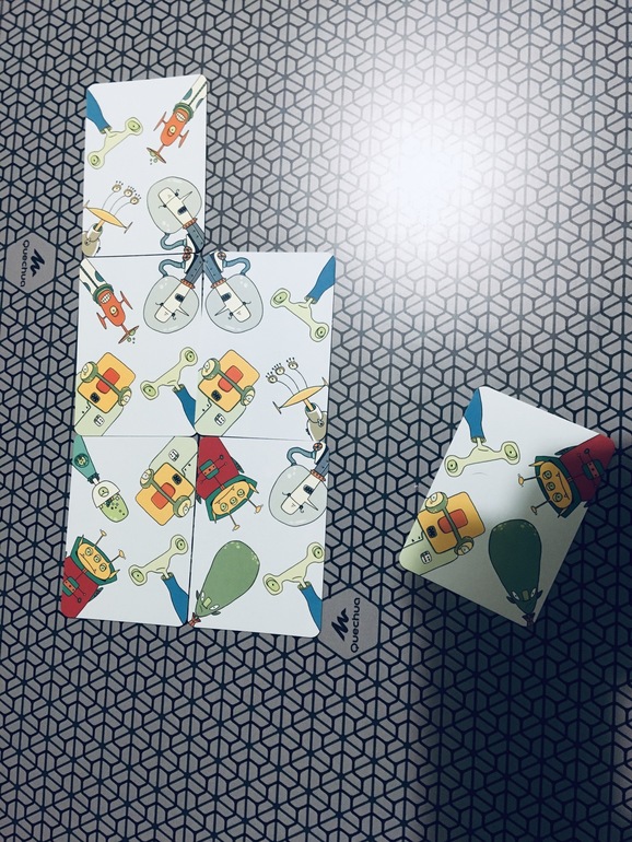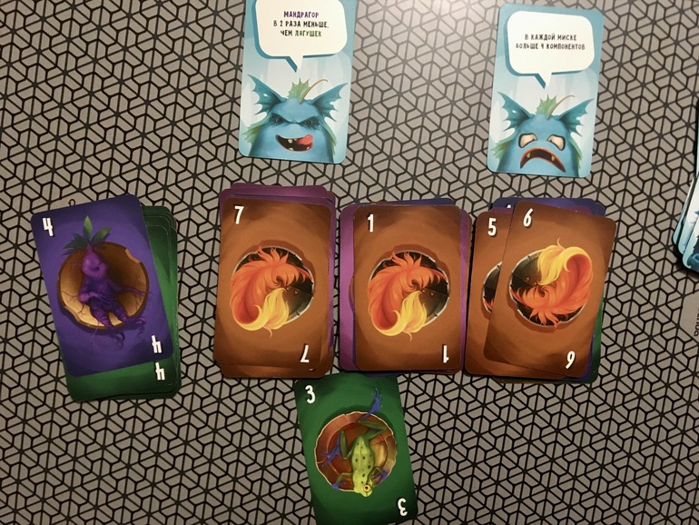Играли с дочкой вдвоём. Когда эта коробочка появилась у нас летом 2018 года, мы с дочкой не могли остановиться, играли и играли каждый день по много партий подряд. Сейчас играем реже, но удовольствие от партии не меньше, чем тогда. Необычная, непохожая на другие, интересная, действительно, очень хорошая карточная игра. Выиграла я, выложив цепочку из 7 желтых драконов.