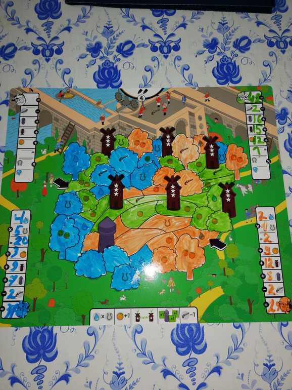 Девятилетняя дочка уверенная в своей победе выбрала уровень посложнее, синий боец, она пошла по подковам умноженным на капельки и заработала 20 очков. А так же решила ещё соединить мельницы - в этом случае, она заработала 9 очков, так как непрерывно соединила 3 мельницы с 3 звёздами, своим цветом, подсобирала 3 апельсинки ( на свеже выжатый сок утром). Ну и на последок, решила оккупировать башню и прилегающую к ней территорию, в следствие чего заработала 7 ПО, правда не увидела в засаде 2 бандитов стреляющих в нее и поэтому 2 ПО потеряла. В итоге набрала 37 очков, оранжевый игрок захватил территории на 29 очков. А вот когда позвали зелёного игрока на проигрыш, не ожидали, что он вырвится вперёд со счетом 42!