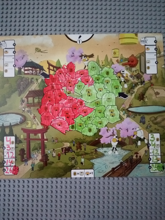 Вот мы играли с сыном, ему почти 5, на лёгком уровне. Сын победил меня с разрывом в одно очко😃 26-25 и сказал, что будет каждый день играть с сестрой. Внизу поля нарисованы наши цели: булочки-добавляют 1 ПО, вот если мы посчитаем сколько котиков съело китайских печенек, то узнаем сколько ПО заработаем в конце игры, естественно вместе с булочками.