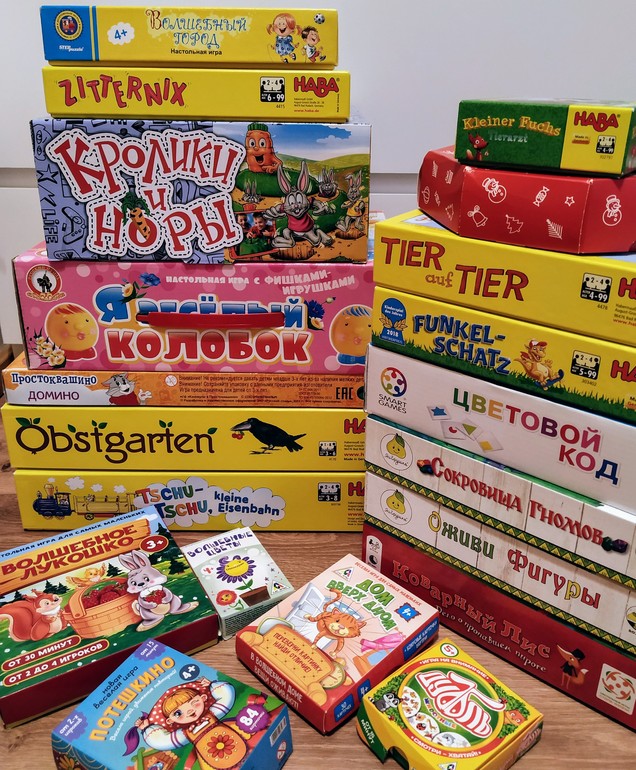 Очень нравятся игры на скорость и внимание. "Дом вверх дном" - вторая по популярности игра. "Дуббль" нравится. Хотела даже купить какую-нибудь другую часть, но в остальных так мало карточек, что передумала. Какое-то время в "Волшебные цветы" ежедневно играли. "Потешкино" отчего-то не пошло.