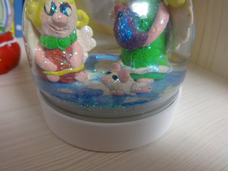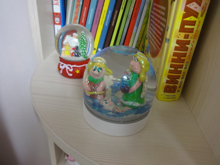 Сделали Снежный шар. Советую, кстати, кто не видел, прекрасная вещь для подарков знакомым и своим детям. Легко делается, блёстки летают как в покупном, красиво смотрится: