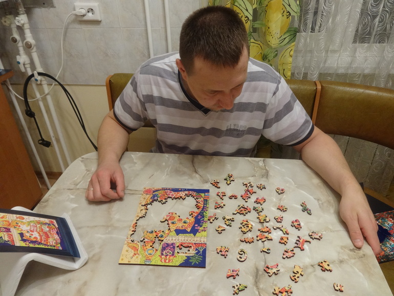 Не могла не сфоткать. Янке быстро наскучило собирать пазлы, в то время как мы только вошли во вкус. Мы с Антоном с увлечением собираем, а Янка пялится в телефон, ох уж эти современные дети(((