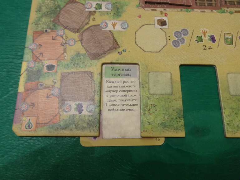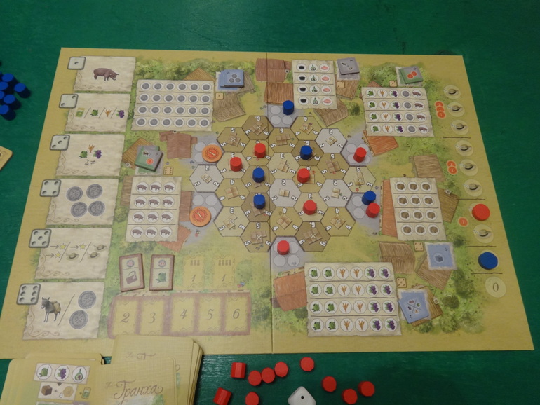 Общее поле с центральной площадью, производственными зданиями, куда вы тоже доставляете ваши товары и урожай, получая за всё победные очки. И да, в игре еще и кубики есть, я в экстазе: