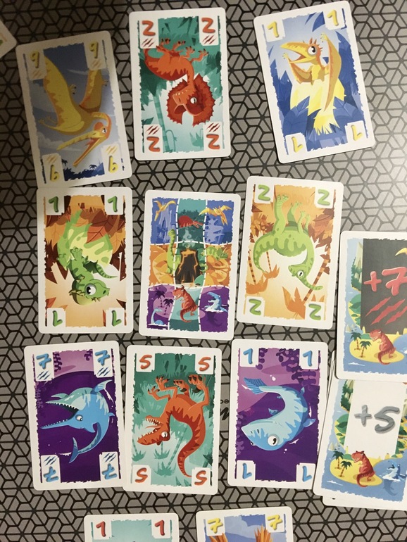 Тоже остров, с которого нужно спасти теперь уже динозавров и пересилить их на свой собственный остров. Необычная игра, красивая, интересная. Рекомендована с 7 лет, появилась у нас, когда сыну только исполнилось 7, трудностей никаких не возникло с пониманием правил. Игра очень понравилась и мне, и детям, особенно сыну. Быстрая , длится всего 10 раундов, ходы игроки делают одновременно. Происходит это так, открыли карту события, выбрали карты с руки, одновременно вскрыли, разобрали динозавров с центрального острова, снова открыли карту событий, снова выбрали карты с руки, снова разобрали карты на свои острова. Финал в этой игре всегда подступает неожиданно. На мой взгляд, отличнейшая карточная игра, однозначно, достойная внимания, особенно, в период скидок. Сыграли одну партию втроём, выиграл сын, обогнав дочку на 2 балла.